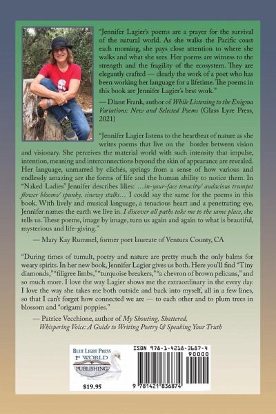 Jennifer Lagier's poems are a prayer for the survival of the natural world. As she walks the Pacific coast each morning, she pays close attention to where she walks and what she sees. Her poems are witness to the strength and the fragility of the ecosystem. They are elegantly crafted - clearly the work of a poet who has been working her language for a lifetime. The poems in this book are Jennifer Lagier's best work. ¿Dr. Jennifer Lagier has published eighteen books. Her work has appeared most recently in From Everywhere a Little: A Migration Anthology, Fire and Rain: Ecopoetry of California, Missing Persons: Reflections on Dementia, Silent Screams: Poetic Journeys Through Addiction & Recovery, Winedrunk Sidewalk, I Am Not a Silent Poet, Song of the San Joaquin, Speckled Trout Review, Syndic Literary Journal. Recent books: Camille Verite (FutureCycle Press), Where We Grew Up (FutureCycle Press), Scene of the Crime (Evening Street Press), Harbingers (Blue Light Press), Camille Abroad (FutureCycle Press), Like a B Movie (FutureCycle Press), Camille Mobilizes (FutureCycle Press), Trumped Up Election (Xi Draconis Books) , Dystopia Playlist (Cyberwit) and Camille Comes Unglued (Cyberwit). Links to her books and anthologies where her work appears may be found at jlagier.net/books.html and jlagier.net/anthologies.html Jennifer earned a Ph.D. from Nova Southeastern University, an MLIS from University of California, Berkeley, and an MA from California State University, Stanislaus. She taught at Modesto Junior College, Hartnell College, California State University, Monterey Bay, and Monterey Peninsula College. She taught with California Poets in the Schools and edited the Homestead Review. Currently, she edits the Monterey Poetry Review and helps coordinate Second Sunday readings for the Monterey Poetry Consortium.