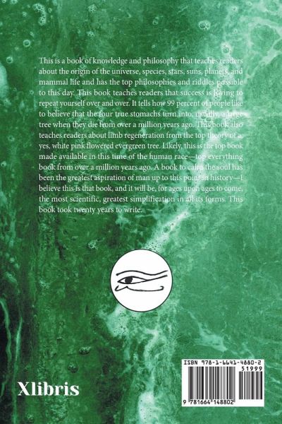 This is a book of knowledge and philosophy that teaches readers about the origin of the universe, species, stars, suns, planets, and mammal life and has the top philosophies and riddles possible to this day. This book teaches readers that success is loving to repeat yourself over and over. It tells how 99 percent of people like to believe that the four true stomachs turn into, usually, a large tree when they die from over a million years ago. This book also teaches readers about limb regeneration from the top theory of a, yes, white pink flowered evergreen tree. Likely, this is the top book made available in this time of the human race-top everything book from over a million years ago. A book to calm the soul has been the greatest aspiration of man up to this point in history-I believe this is that book, and it will be, for ages upon ages to come, the most scientific, greatest simplification in all its forms. This book took twenty years to write.