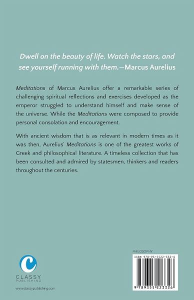 Meditations of Marcus Aurelius offer a remarkable series of challenging spiritual reflections and exercises developed as the emperor struggled to understand himself and make sense of the universe. While the Meditations were composed to provide personal consolation and encouragement. With ancient wisdom that is as relevant in modern times as it was then, Aurelius' Meditations is one of the greatest works of Greek and philosophical literature. A timeless collection that has been consulted and admired by statesmen, thinkers and readers throughout the centuries.
