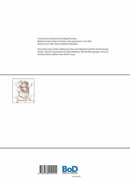 Lernen Sie das Geheimnis der Kalligrafie kennen.Befreien Sie ihren Körper von Stress, dann regeneriert er sich selbst. Heilen Sie sich selbst, durch meditative Kalligrafie.Dieses Buch ist der ideale Leitfaden für jeden, der Kalligrafie Schritt für Schritt erlernen möchte. Auch für die praktische Schriftausbildung in Berufsschulen geeignet. Seien Sie, mit diesem Buch, anderen einen Schritt voraus.