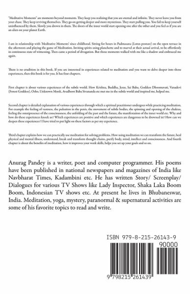 "Meditative Moments" are moments beyond moments. They keep you realizing that you are eternal and infinite. They never leave you from your chase. They keep reviving themselves. They go on getting deeper and more mysterious. They start pulling you. You fail to keep yourself uninfluenced by them. Slowly you drown in them. The doors of the inner world start opening one after the other and you feel as if you are an alien on your planet Earth. I am in relationship with 'Meditative Moments' since childhood. Sitting for hours in Padmasana (Lotus posture) on the open terrace in the afternoon and playing the game of Meditation. Inviting spirits using planchette and to marvel at their actual arrival, to be effortlessly in continuous state of witnessing. Then came a period of divagation. But those moments walked with me like a shadow and embraced me again. There is no erudition in this book. If you are interested in experiences related to meditation and you want to delve deeper into those experiences, then this book is for you. It has four chapters. First chapter is about various experiences of the subtle world. How Krishna, Buddha, Jesus, Sai Baba, Goddess Dhoomavati, Vanadevi (Forest Goddess), Osho, Unknown Monk, Avadhoot Baba Sivananda etc met me in the subtle world and inspired me, helped me. Second chapter is detailed explanation of various experiences through which a spiritual practitioner undergoes while practicing meditation. For example the feeling of vastness, the pulsation in the penis, the movement of subtle bodies, the spinning and opening of the chakras, feeling the omnipresence of the consciousness, the unfolding of the past and the future, the manifestation of the inner world etc. Why and how do these experiences knock us? Which experiences are positive and which experiences are dangerous to be drowned in? How can we deepen these experiences? I have tried to put light on these factors as per my experience. Third chapter explains how we can practically use meditation for solving problems. How using meditation we can transform the future, heal physical and mental illness, understand, break and transform thought chains, purify body, mind, intellect and consciousness. And fourth chapter is about the benefits of meditation, how it improves your work skills, helps you set up your goals and so on.