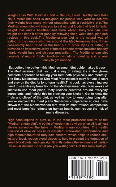 Weight Loss With Minimal Effort - Natural, Heart Healthy And Delicious Meals This book is designed for people who want to achieve their weight loss goals without struggling with a restrictive diet. The Mediterranean diet will help you to eat natural foods that lead to faster weight loss and a healthier and more vibrant body. You can lose weight and keep it off for good by following the 4-week meal plan and recipes in this book. The Mediterranean diet is the natural way of eating of the people who live around the Mediterranean Sea. It has consistently been rated as the best out of other styles of eating. It provides an impressive array of health benefits which includes healthy heart, weight loss and disease prevention. The Mediterranean diet consists of natural foods, involves no calorie counting and is very easy to get used to. Eat better, live better-this Mediterranean diet guide makes it easy. The Mediterranean diet isn't just a way of eating, it's a lifestyle-a complete approach to feeling your best both physically and mentally. The Easy Mediterranean Diet Meal Plan makes it easy for you to start and stay on the diet for long-term health. This book has everything you need to seamlessly transition to the Mediterranean diet: four weeks of simple-to-use meal plans, tasty recipes centered around everyday ingredients, and helpful tips for stocking your kitchen. Get to know the "nuts and olives" of the diet, as well as how to keep going long after you've enjoyed the meal plans. Numerous comparative studies have shown that the Mediterranean diet, with its most rational composition and most beneficial effects on human health, can reduce the risk of many diseases. High consumption of olive oil is the most prominent feature of the "Mediterranean diet". A bottle of verdant extra virgin olive oil is almost always served on the table in Mediterranean countries. The health function of olive oil lies in its excellent antioxidant performance and high monounsaturated fatty acid content, which helps to reduce cholesterol level, reduce blood viscosity, help to prevent the formation of small blood clots, and can significantly reduce the incidence of cardiovascular disease. So what are you wating for? Get this book today!!