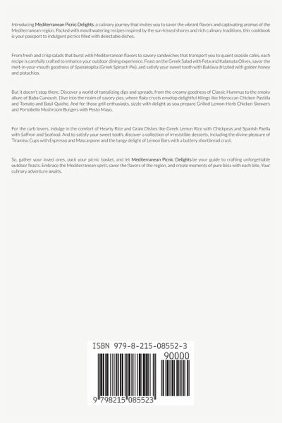 Introducing Mediterranean Picnic Delights, a culinary journey that invites you to savor the vibrant flavors and captivating aromas of the Mediterranean region. Packed with mouthwatering recipes inspired by the sun-kissed shores and rich culinary traditions, this cookbook is your passport to indulgent picnics filled with delectable dishes. From fresh and crisp salads that burst with Mediterranean flavors to savory sandwiches that transport you to quaint seaside cafes, each recipe is carefully crafted to enhance your outdoor dining experience. Feast on the Greek Salad with Feta and Kalamata Olives, savor the melt-in-your-mouth goodness of Spanakopita (Greek Spinach Pie), and satisfy your sweet tooth with Baklava drizzled with golden honey and pistachios. But it doesn't stop there. Discover a world of tantalizing dips and spreads, from the creamy goodness of Classic Hummus to the smoky allure of Baba Ganoush. Dive into the realm of savory pies, where flaky crusts envelop delightful fillings like Moroccan Chicken Pastilla and Tomato and Basil Quiche. And for those grill enthusiasts, sizzle with delight as you prepare Grilled Lemon-Herb Chicken Skewers and Portobello Mushroom Burgers with Pesto Mayo. For the carb lovers, indulge in the comfort of Hearty Rice and Grain Dishes like Greek Lemon Rice with Chickpeas and Spanish Paella with Saffron and Seafood. And to satisfy your sweet tooth, discover a collection of irresistible desserts, including the divine pleasure of Tiramisu Cups with Espresso and Mascarpone and the tangy delight of Lemon Bars with a buttery shortbread crust. So, gather your loved ones, pack your picnic basket, and let Mediterranean Picnic Delights be your guide to crafting unforgettable outdoor feasts. Embrace the Mediterranean spirit, savor the flavors of the region, and create moments of pure bliss with each bite. Your culinary adventure awaits.