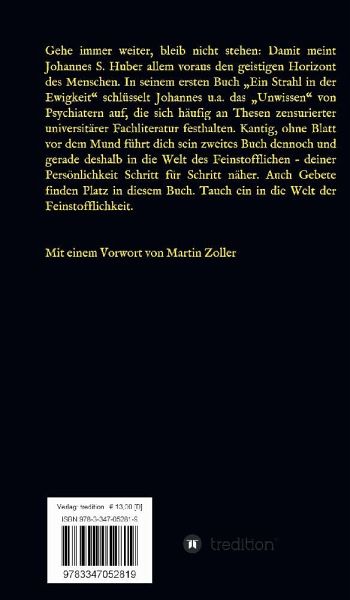 Gehe immer weiter, bleib nicht stehen: Damit meint Johannes S. Huber allem voraus den geistigen Horizont des Menschen. In seinem ersten Buch "Ein Strahl in der Ewigkeit" schlüsselt Johannes u.a. das "Unwissen" von Psychiatern auf, die sich häufig an Thesen zensurierter universitärer Fachliteratur festhalten. Kantig, ohne Blatt vor dem Mund führt dich sein zweites Buch dennoch und gerade deshalb in die Welt des Feinstofflichen - deiner Persönlichkeit Schritt für Schritt näher. Auch Gebete finden Platz in diesem Buch. Tauch ein in die Welt der Feinstofflichkeit.