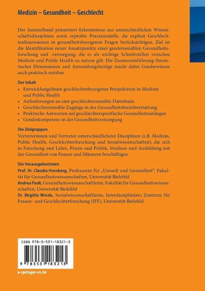 Entwicklungslinien und theoretische Annäherungen an geschlechterdifferente Perspektiven in Medizin und Public Health.- Methodische Anforderungen an eine geschlechtersensible Datenbasis.- Geschlechterbezogene Gesundheitsanliegen in besonderen Lebenskontexten und Lebenslagen.