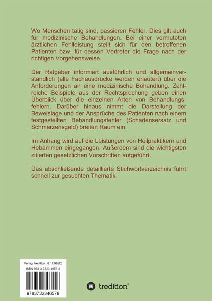 Im Anhang werden die Behandlung durch Heilpraktiker und die Leistungen von Hebammen auch unter Haftungsgesichtspunkten dargestellt. Es folgt eine Zusammenfassung der wichtigsten zitierten Gesetzesvorschriften. Den Abschluss bildet ein ausführliches Stichwortverzeichnis.