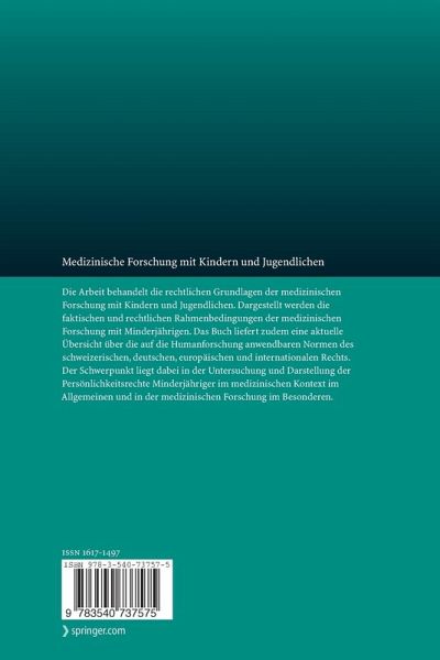 Die Arbeit behandelt die rechtlichen Grundlagen der medizinischen Forschung mit Kindern und Jugendlichen. Dargestellt werden die faktischen und rechtlichen Rahmenbedingungen der medizinischen Forschung mit Minderjährigen. Das Buch liefert zudem eine aktuelle Übersicht über die auf die Humanforschung anwendbaren Normen des schweizerischen, deutschen, europäischen und internationalen Rechts. Der Schwerpunkt liegt dabei in der Untersuchung und Darstellung der Persönlichkeitsrechte Minderjähriger im medizinischen Kontext im Allgemeinen und in der medizinischen Forschung im Besonderen.