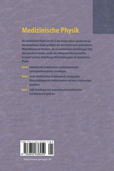 Die medizinische Physik hat sich in den letzten Jahren zunehmend als interdisziplinäres Gebiet profiliert. Um dem Bedarf nach systematischer Weiterbildung von Physikern, die an medizinischen Einrichtungen tätig sind, gerecht zu werden, wurde ein dreibändiges Werk konzipiert. Es basiert auf dem Heidelberger Kurs für medizinische Physik und vermittelt das für die Fachanerkennung als Medizinphysiker notwendige medizinische und physikalische Wissen. Der nun vorliegende Band 1 behandelt die medizinischen, medizintechnischen und biomathematischen Grundlagen. Band 2 ist der medizinischen Strahlenphysik, Tomographie, Ultraschalldiagnose, Nuklearmedizin und dem Strahlenschutz gewidmet. Band 3 stellt Grundlagen und Anwendung der medizinischen Laserphysik und Optik vor.