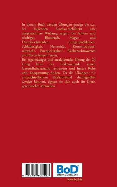 In diesem Buch werden Übungen gezeigt die u.a. bei folgenden Beschwerdebildern eine ausgezeichnete Wirkung zeigen: bei hohem und niedrigen Blutdruck, Magen- und Darmbeschwerden, Lungenproblemen, Schlaflosigkeit, Nervosität, Konzentrationsschwäche, Energielosigkeit, Rückenschmwerzen und übermässigem Stress.Bei regelmässiger und ausdauernder Übung des Qi Gong kann der Praktizierende seinen Gesundheitszustand verbessern und innere Ruhe und Entspannung finden. Da die Übungen mit unterschiedlichem Kraftaufwand durchgeführt werden können, eignen sie sich auch für ältere, geschwächte Menschen.