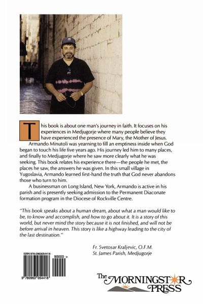 This inspirational work is a "true story" about one man's journey in search of his God. His adventure led him to Medjugorje, a remote village in Yugoslavia. A place referred to by many as a "place of miracles." Brought back by popular demand. Many people believe that the Blessed Virgin Mary has been appearing on a daily basis since June 24, 1981 to six (6) young visionaries all from Local peasant families. Our Lady's messages are given to the world through them in a 'state of rapture' at the time of the apparitions. In her own words, Our Lady initially said, "I come to tell the world that God exists!" her many messages are calling us to increased faith, conversion and prayer. "Pray, Pray, Pray my children" she says, and often adds, "If you only knew what awaits you in heaven" and how much God loves you" she tells us.