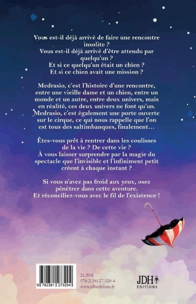 Vous est-il déjà arrivé de faire une rencontre insolite ? Vous est-il déjà arrivé d¿être attendu par quelqüun ? Et si ce quelqüun était un chien ? Et si ce chien avait une mission ? Medrasio, c¿est l¿histoire d¿une rencontre, entre une vieille dame et un chien, entre un monde et un autre, entre deux univers, mais en réalité, ces deux univers ne font qüun. Medrasio, c¿est également une porte ouverte sur le cirque, ce qui nous rappelle que l¿on est tous des saltimbanques, finalement¿ Êtes-vous prêt à rentrer dans les coulisses de la vie ? De cette vie ? À vous laisser surprendre par la magie du spectacle que l¿invisible et l¿infiniment petit créent à chaque instant ? Si vous n¿avez pas froid aux yeux, osez pénétrer dans cette aventure. Et réconciliez-vous avec le fil de l¿existence ! - Découvrez le dernier roman d¿Arnaud Dangoisse, auteur de la saga « Brillante, une jument pour deux destins », chez JDH Éditions.