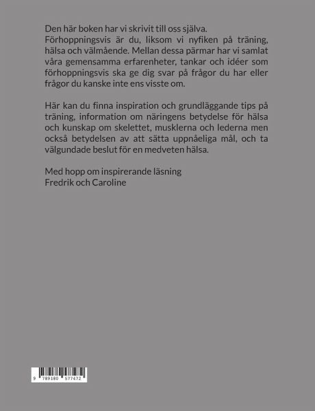 Den här boken har vi skrivit till oss själva. Förhoppningsvis är du, liksom vi nyfiken på träning, hälsa och välmående. Mellan dessa pärmar har vi samlat våra gemensamma erfarenheter, tankar och idéer som förhoppningsvis ska ge dig svar på frågor du har eller frågor du kanske inte ens visste om. Här kan du finna inspiration och grundläggande tips på träning, information om näringens betydelse för hälsa och kunskap om skelettet, musklerna och lederna men också betydelsen av att sätta uppnåeliga mål, och ta välgundade beslut för en medveten hälsa.