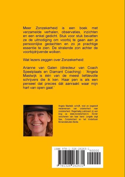 Meer Zonzekerheid is een boek met verzamelde korte verhalen, observaties, inzichten en een enkel gedicht. Stuk voor stuk bevatten ze een uitnodiging om voorbij te gaan aan je persoonlijke gedachten en je prachtige essentie te zien. De stralende zon achter de voorbijdrijvende wolken. Wat lezers zeggen over Zonzekerheid: Arianne van Galen (directeur Coach Speelplaats en Diamant Coaching): 'Angela Mastwijk is één van de meest liefdevolle schrijvers die ik ken. Haar pen is als een penseel dat precies dát aanraakt waar mijn hart van open gaat.'