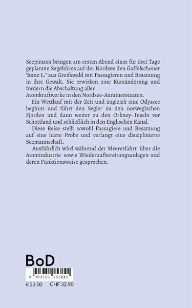 Seepiraten bringen am ersten Abend eines für drei Tage geplanten Segeltörns auf der Nordsee den Gaffelschoner "Anne L." aus Greifswald mit Passagieren und Besatzung in ihre Gewalt. Sie erwirken eine Kursänderung und fordern die Abschaltung allerAtomkraftwerke in den Nordsee-Anrainerstaaten. Ein Wettlauf mit der Zeit und zugleich eine Odyssee beginnt und führt den Segler bis zu den norwegischen Fjorden und dann weiter zu den Orkney-Inseln vor Schottland und schließlich in den Englischen Kanal. Diese Reise stellt sowohl Passagiere und Besatzung auf eine harte Probe und verlangt eine disziplinierte Seemannschaft. Zugleich wird sehr verständlich die Problematik der Atomindustrie und der Wiederaufbereitungsanlagen beschrieben.