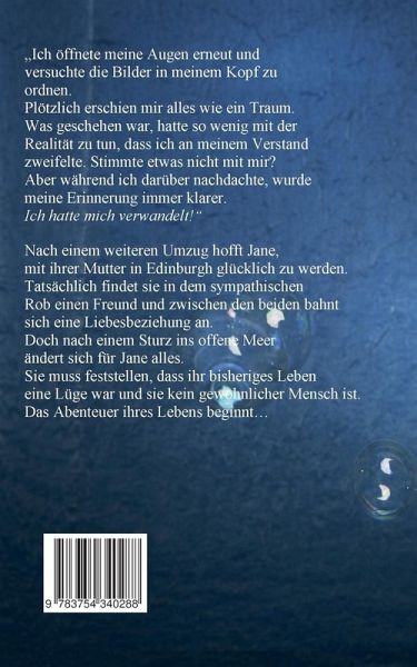 "Ich öffnete meine Augen erneut und versuchte die Bilder in meinem Kopf zu ordnen. Plötzlich erschien mir alles wie ein Traum. Was geschehen war, hatte so wenig mit der Realität zu tun, dass ich an meinem Verstand zweifelte. Stimmte etwas nicht mit mir? Aber während ich darüber nachdachte, wurde meine Erinnerung immer klarer. Ich hatte mich verwandelt!"Nach einem weiteren Umzug hofft Jane, mit ihrer Mutter in Edinburgh glücklich zu werden. Tatsächlich findet sie in dem sympathischen Rob einen Freund und zwischen den beiden bahnt sich eine Liebesbeziehung an. Doch nach einem Sturz ins offene Meer ändert sich für Jane alles. Sie muss feststellen, dass ihr bisheriges Leben eine Lüge war und sie kein gewöhnlicher Mensch ist. Das Abenteuer ihres Lebens beginnt...