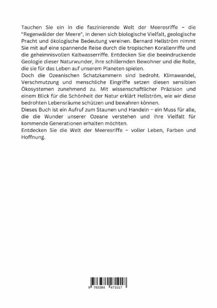 Tauchen Sie ein in die faszinierende Welt der Meeresriffe - die "Regenwälder der Meere", in denen sich biologische Vielfalt, geologische Pracht und ökologische Bedeutung vereinen. Bernard Hellström nimmt Sie mit auf eine spannende Reise durch die tropischen Korallenriffe und die geheimnisvollen Kaltwasserriffe. Entdecken Sie die beeindruckende Geologie dieser Naturwunder, ihre schillernden Bewohner und die Rolle, die sie für das Leben auf unserem Planeten spielen.Doch die Ozeanischen Schatzkammern sind bedroht. Klimawandel, Verschmutzung und menschliche Eingriffe setzen diesen sensiblen Ökosystemen zunehmend zu. Mit wissenschaftlicher Präzision und einem Blick für die Schönheit der Natur erklärt Hellström, wie wir diese bedrohten Lebensräume schützen und bewahren können.Dieses Buch ist ein Aufruf zum Staunen und Handeln - ein Muss für alle, die die Wunder unserer Ozeane verstehen und ihre Vielfalt für kommende Generationen erhalten möchten.Entdecken Sie die Welt der Meeresriffe -voller Leben, Farben und Hoffnung.