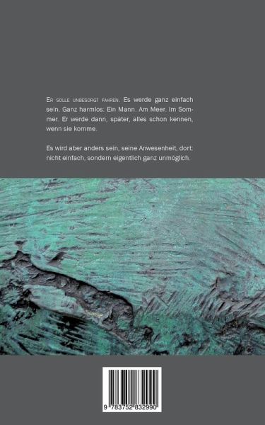 Er solle unbesorgt fahren. Es werde ganz einfach sein.Ganz harmlos: Ein Mann. Am Meer. Im Sommer. Er werde dann, später, alles schon kennen, wenn sie komme.Es wird aber anders sein, seine Anwesenheit, dort: Nicht einfach, sondern eigentlich ganz unmöglich.