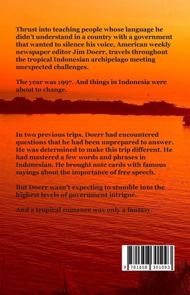 Thrust into teaching people whose language he didn't understand in a country with a government that wanted to silence his voice, American weekly newspaper editor Jim Doerr, travels throughout the tropical Indonesian archipelago meeting unexpected challenges. The year was 1997. And things in Indonesia were about to change. In two previous trips, Doerr had encountered questions that he had been unprepared to answer. He was determined to make this trip different. He had mastered a few words and phrases in Indonesian. He brought note cards with famous sayings about the importance of free speech. But Doerr wasn't expecting to stumble into the highest levels of government intrigue. And a tropical romance was only a fantasy.