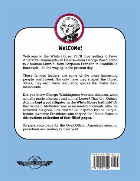 A page-turning, kid-friendly discovery-guide to the United States Presidents. Meet each US president in a speedy, unforgettable two minutes! From Scott Peters, award-winning author and creator of over 300 museum and science center exhibits. Readers will get a quick feel for each president's accomplishments, along with their fascinating quirks! Did you know George Washington's wooden dentures were actually made of screws and animal bones? That John Quincy Adams kept a pet alligator in the White House bathtub? Or that William McKinley was assassinated moments after he removed his good luck charm? Be inspired by the unique, heroic, inventive Presidents who shaped the United States in this curious collection of fact-filled pages. Inside you'll find beautifully laid out pages with: ¿ A greeting photo introducing the president and his name ¿ Key facts, including birthplace; dates served; cause of death; and presidential number ¿ An inspirational quote from each president ¿ A spotlight bubble explaining how the president is remembered ¿ A strange and fascinating facts box with a list of interesting and sometimes wacky facts about the president Kids will love getting to know America's Commander in Chiefs, from George Washington to Abraham Lincoln, from Benjamin Franklin to Franklin D. Roosevelt, all the way up to the present day. Great for trivia lovers, school projects, homeschooling, American history studies, homework studies, and much more. ¿So pack your bags for the Oval Office . . . America's amazing presidents are waiting to meet you!