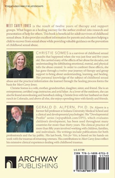 Christie Somes is a survivor of childhood sexual assaults that happened when she was just four and five years old. She carried many of the effects of her abuse for decades, not understanding the debilitating emotional, mental, and physical tolls the abuse created. In order to confront these effects, she has gone through a twelve-year journey of therapy and group support to bring about understanding, learning, and healing. Her personal knowledge of the subject of childhood sexual abuse and the practical information she learned through the healing process forms the basis for Meet Carey Jones. Christie Somes is a wife, mother, grandmother, daughter, sister, and friend. She is an entrepreneur, certified yoga instructor, and avid hiker. As a lover of the outdoors, she can also be found snowshoeing and horseback riding. Christie lives with her husband on their ranch in Colorado, and above all else, she enjoys spending time with family and friends. Gerald D. Alpern, PH.D.Dr. Alpern is a former full professor at Indiana University Medical School and a clinical and developmental psychologist. His "Developmental Profile" series (wpspublish.com/DP3), which evaluates children's development, has been used throughout many countries for more than thirty years. His clinical practice of more than fifty years involved working with children, families, and individuals. His writings include publications for both professionals and the lay public. His last book, Vets for Vets, is based on his hands-on work with the traumas of returning veterans. His contributions to Meet Carey Jones reflect his extensive clinical experience dealing with childhood traumas.