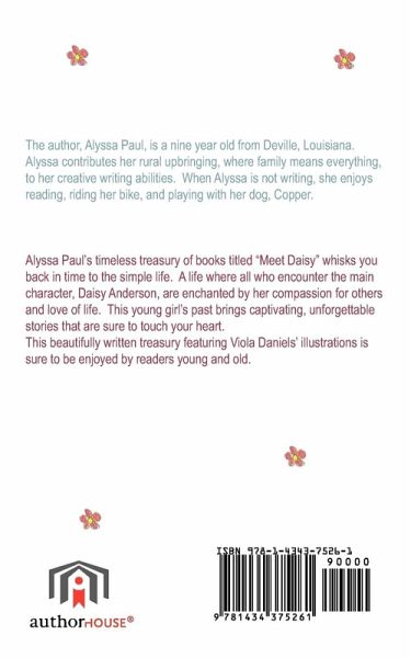 Alyssa Paul's timeless treasury of books titled "Meet Daisy" whisks you back in time to the simple life. A life where all who encounter the main character, Daisy Anderson, are enchanted by her compassion for others and love of life. This young girl's past brings captivating, unforgettable stories that are sure to touch your heart. This beautifully written treasury featuring Viola Daniels' illustrations is sure to be enjoyed by readers young and old.