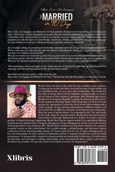 "Meet, Date, Get Engaged, and Married in 90 Days" answers all issues you've been facing in choosing your mate. This book is a step-by-step guide for women who are looking for someone special but don't know how to find him or it also covers the key principles and the characteristics to look for in a man for you not to waste your time. This masterpiece also prepares you with the right tools, knowledge, experience, attitude, and wisdom to choose the right leader for your children to look up to. All the secrets you need are included in this book. Are you single, dating, in a complicated relationship, separated, divorced, or uncertain about your relationship? When a man sees you, why does he only associate you with pleasure, having fun, or even having his child but does not envision you as his wife? Why are you stuck in the never-ending cycle of dating and unable to move on to the next step toward marriage? You feel prepared, educated, articulated, beautiful inside and out, yet it seems no man wants to marry you? What are the spiritual implications involved in not being able to find a man or getting married? This masterpiece sheds new light on the whole process of finding the right man, getting prepared for marriage, and then getting married in the shortest time possible. Read this book and get ready to walk down the aisle. "Meet, Date, Get Engaged and Married in 90 Days"; 77 secrets that will make him marry you in less than 12 weeks.