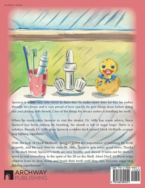 Spencer is a little boy who loves to have fun. To make more time for fun, he rushes through his chores and is very proud of how quickly he gets things done before going out and playing with friends. One of the things he always rushes is brushing his teeth. When his mom takes Spencer to visit the dentist, Dr. Milly has some advice. Since Spencer has been rushing his brushing, his mouth is full of sugar bugs! There is a solution, though. Dr. Milly gives Spencer a rubber duck named Duck McBrush-a sugar bug fighting superhero. With the help of Duck McBrush, Spencer learns the importance of brushing his teeth properly, and the next time he visits Dr. Milly, Spencer gets some good news. Thanks to his duck friend, Spencer's teeth are now healthy and shined. It turns out he doesn't need to rush everything. In the spirit of the Elf on the Shelf, Meet Duck McBrush helps children learn to slow down and brush their teeth until they, too, become sugar bug fighting superheroes!
