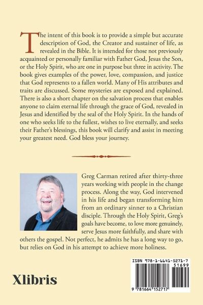The intent of this book is to provide a simple but accurate description of God, the Creator and sustainer of life, as revealed in the Bible. It is intended for those not previously acquainted or personally familiar with Father God, Jesus the Son, or the Holy Spirit, who are one in purpose but three in activity. The book gives examples of the power, love, compassion, and justice that God represents to a fallen world. Many of His attributes and traits are discussed. Some mysteries are exposed and explained. There is also a short chapter on the salvation process that enables anyone to claim eternal life through the grace of God, revealed in Jesus and identified by the seal of the Holy Spirit. In the hands of one who seeks life to the fullest, wishes to live eternally, and seeks their Father's blessings, this book will clarify and assist in meeting your greatest need. God bless your journey.