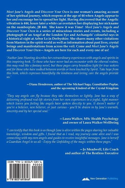 Meet Jane's Angels and Discover Your Own is one woman's amazing account of her spiritual journey, which reopens at the age of 44 when Angels appear to her and encourage her to spread her light. Having discovered that the Angelic vibration is 444, hours later a white car overtakes her displaying her nickname on the numberplate, JB 444. She knew it was Time! Meet Jane's Angels and Discover Your Own is a series of miraculous stories and events, including a photograph of an Angel at the London Eye and Archangels' colourful rays in a historical sight at Arbor Lo in Derbyshire. She shares many other visitations from Masters in the spirit world as well as information about past lives, crystal beings and manifestations from across the veil. Come and Meet Jane's Angels and Discover Your Own-Angels are here for each and every one of us! 'Author Jane Hunting describes her extraordinary experiences with angels and spirits in this inspiring book. To those who have never had an encounter with the ethereal realms, this may read like a fantasy novel, but these pages carry boundless light for true seekers and for those who have walked between worlds or been touched by Spirit. Take hope from this book, which expresses beautifully the kindness and loving care the angels provide us.' -Diana Henderson, author of The Michael Saga, Grandfather Poplar, and the upcoming Kindred of the Crystal Kingdom 'They say angels can fly because they take themselves so lightly. Jane has a way of delivering profound real-life stories from her own experiences in a joyful, light manner which leaves you feeling like angels have spoken directly to you. It doesn't matter if you're a believer, non believer, or just curious - you'll be drawn in by Jane's warmth, sincerity and by her special soul.' -Laura Walker, MSc Health Psychology and owner of Laura Walker Wellbeing 'I can testify that this book is as though Jane is alive within the pages sharing her valuable knowledge, wisdom and gifts. I found that as I read, my journey came alive and I was connecting with my own angels and guides to receive insightful messages. Jane is herself a Guardian Angel to us all - Enjoy the Unfolding of the magic within these pages.' -Jo Meadwell, Life Coach and author of The Restless Executive.