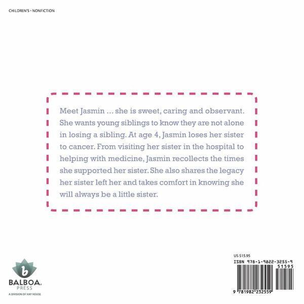 Meet Jasmin ... she is sweet, caring and observant. She wants young siblings to know they are not alone in losing a sibling. At age 4, Jasmin loses her sister to cancer. From visiting her sister in the hospital to helping with medicine, Jasmin recollects the times she supported her sister. She also shares the legacy her sister left her and takes comfort in knowing she will always be a little sister.