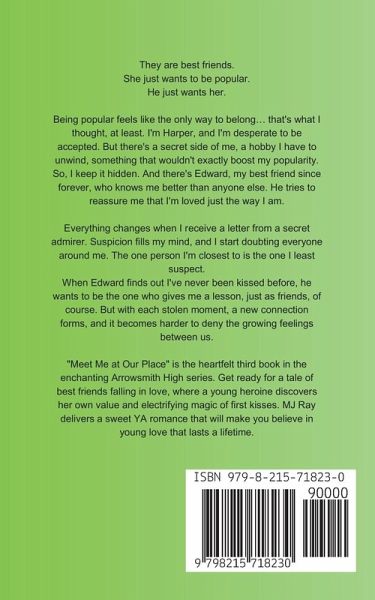 They are best friends. She just wants to be popular. He just wants her. Being popular feels like the only way to belong... that's what I thought, at least. I'm Harper, and I'm desperate to be accepted. But there's a secret side of me, a hobby I have to unwind, something that wouldn't exactly boost my popularity. So, I keep it hidden. And there's Edward, my best friend since forever, who knows me better than anyone else. He tries to reassure me that I'm loved just the way I am. Everything changes when I receive a letter from a secret admirer. Suspicion fills my mind, and I start doubting everyone around me. The one person I'm closest to is the one I least suspect. When Edward finds out I've never been kissed before, he wants to be the one who gives me a lesson, just as friends, of course. But with each stolen moment, a new connection forms, and it becomes harder to deny the growing feelings between us. "Meet Me at Our Place" is the heartfelt third book in the enchanting Arrowsmith High series. Get ready for a tale of best friends falling in love, where a young heroine discovers her own value and electrifying magic of first kisses. MJ Ray delivers a sweet YA romance that will make you believe in young love that lasts a lifetime.