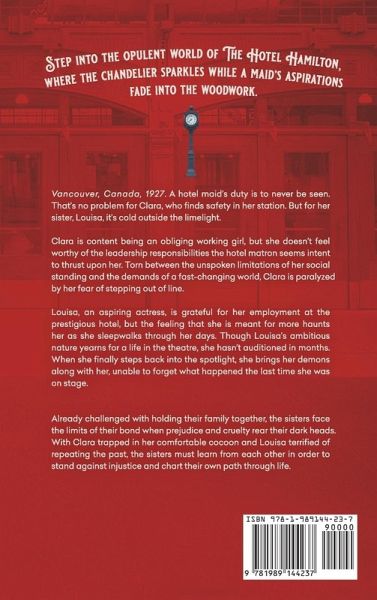 Step into the opulent world of The Hotel Hamilton, where the chandelier sparkles while a maid's aspirations fade into the woodwork. Vancouver, Canada, 1927. A hotel maid's duty is to never be seen. That's no problem for Clara, who finds safety in her station. But for her sister, Louisa, it's cold outside the limelight. Clara is content being an obliging working girl, but she doesn't feel worthy of the leadership responsibilities the hotel matron seems intent to thrust upon her. Torn between the unspoken limitations of her social standing and the demands of a fast-changing world, Clara is paralyzed by her fear of stepping out of line. Louisa, an aspiring actress, is grateful for her employment at the prestigious hotel, but the feeling that she is meant for more haunts her as she sleepwalks through her days. Though Louisa's ambitious nature yearns for a life in the theatre, she hasn't auditioned in months. When she finally steps back into the spotlight, she brings her demons along with her, unable to forget what happened the last time she was on stage. Already challenged with holding their family together, the sisters face the limits of their bond when prejudice and cruelty rear their dark heads. With Clara trapped in her comfortable cocoon and Louisa terrified of repeating the past, the sisters must learn from each other in order to stand against injustice and chart their own path through life.