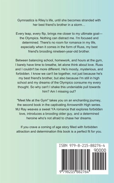 Gymnastics is Riley's life, until she becomes stranded with her best friend's brother in a storm... Every leap, every flip, brings me closer to my ultimate goal-the Olympics. Nothing can distract me. I'm focused and determined. There's no room for romance in my life, especially when it comes in the form of Russ, my best friend's brooding nineteen-year-old brother. Between balancing school, homework, and hours at the gym, I barely have time to breathe, let alone think about love. Russ and I couldn't be more different. He's moody, mysterious, and forbidden. I know we can't be together, not just because he's my best friend's brother, but also because I'm still in high school and my dreams of the Olympics consume my every thought. So why can't I shake this undeniable pull towards him? Am I missing out? "Meet Me at the Gym" takes you on an enchanting journey, the second book in the captivating Arrowsmith High series. MJ Ray weaves a sweet YA romance that explores forbidden love, introduces a brooding older guy, and a determined heroine who's not afraid to chase her dreams. If you crave a coming of age story filled with forbidden attraction and determination this book is a perfect fit for you. Don't miss out on "Meet Me at the Gym," a heartfelt YA romance that will have you rooting for love against all odds.