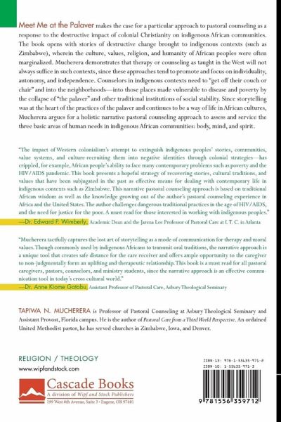 Meet Me at the Palaver makes the case for a particular approach to pastoral counseling as a response to the destructive impact of colonial Christianity on indigenous African communities. The book opens with stories of destructive change brought to indigenous contexts (such as Zimbabwe, Africa), wherein the culture, values, religion, and humanity of African peoples were often marginalized. Mucherera demonstrates that therapy or counseling as taught in the West will not always suffice in such contexts, since these approaches tend to promote and focus on individuality, autonomy, and independence. Counselors in indigenous contexts need to "get off their couch or chair" and into the neighborhoods--into those places made vulnerable to disease and poverty by the collapse of "the palaver" and other traditional institutions of social stability. Since storytelling was at the heart of the practices of the palaver and continues to be a way of life in African cultures, Mucherera argues for a holistic narrative pastoral counseling approach to assess and service the three basic areas of human needs in indigenous African communities: body, mind, and spirit.