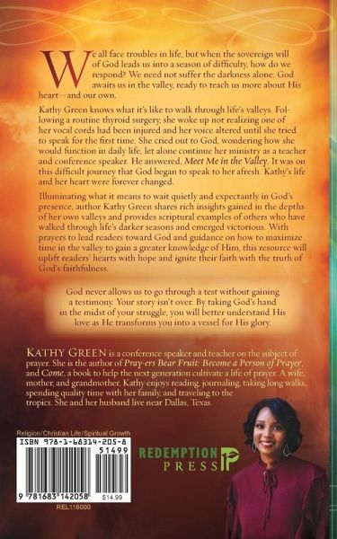 We all face troubles in life, but when the sovereign will of God leads us into a season of difficulty, how do we respond? We need not suffer the darkness alone. God awaits us in the valley, ready to teach us more about His heart-and our own. Kathy Green knows what it's like to walk through life's valleys. Following a routine thyroid surgery, she woke up not realizing one of her vocal cords had been injured and her voice altered until she tried to speak for the first time. She cried out to God, wondering how she would function in daily life, let alone continue her ministry as a teacher and conference speaker. He answered, Meet Me in the Valley. It was on this difficult journey that God began to speak to her afresh. Kathy's life and her heart were forever changed. Illuminating what it means to wait quietly and expectantly in God's presence, author Kathy Green shares rich insights gained in the depths of her own valleys and provides scriptural examples of others who have walked through life's darker seasons and emerged victorious. With prayers to lead readers toward God and guidance on how to maximize time in the valley to gain a greater knowledge of Him, this resource will uplift readers' hearts with hope and ignite their faith with the truth of God's faithfulness. God never allows us to go through a test without gaining a testimony. Your story isn't over. By taking God's hand in the midst of your struggle, you will better understand His love as He transforms you into a vessel for His glory.