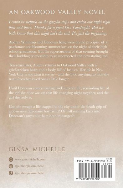 I could've stepped on the gazebo steps and ended our night right then and there. Thanks for a great kiss. Goodnight. But we both know that this night isn't the end. It's just the beginning. Audrey Winthrop and Donovan King were on the precipice of a passionate and blooming summer love on the night of their high school graduation. But the repercussions of that evening brought their budding relationship to an unexpected and devastating end. Ten years later, Audrey returns to Oakwood Valley with a grief-stricken heart and a body full of bruises. Her life in New York City is not what it seems-and she'll do anything to hide the truth from her loved ones a little longer. Until Donovan comes soaring back into her life, reminding her of the girl she once was on that life-changing night together, and the girl she truly is. Can she escape a life trapped in the city under the death grip of a possessive billionaire boyfriend? Or will running back into Donovan's arms put them both in danger? Meet Me in the Vines is Book 1 in the Oakwood Valley Series. It is considered an interconnected stand alone, and books can be read in any order. HEA guaranteed.