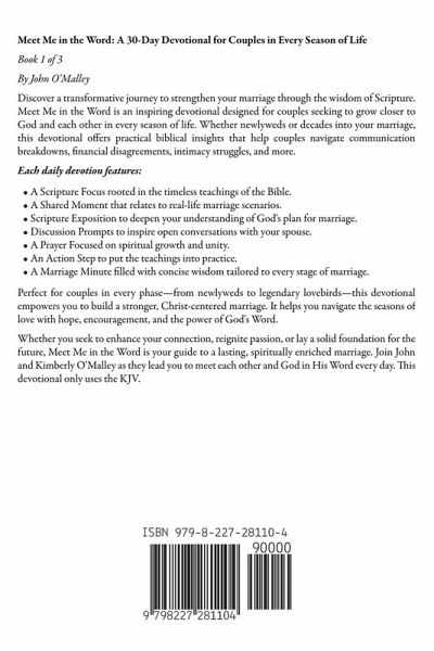 Meet Me in the Word: A 30-Day Devotional for Couples in Every Season of Life Book 1 of 3 By John O'Malley Discover a transformative journey to strengthen your marriage through the wisdom of Scripture. Meet Me in the Word is an inspiring devotional designed for couples seeking to grow closer to God and each other in every season of life. Whether newlyweds or decades into your marriage, this devotional offers practical biblical insights that help couples navigate communication breakdowns, financial disagreements, intimacy struggles, and more. Each daily devotion features:A Scripture Focus rooted in the timeless teachings of the Bible. A Shared Moment that relates to real-life marriage scenarios. Scripture Exposition to deepen your understanding of God's plan for marriage. Discussion Prompts to inspire open conversations with your spouse. A Prayer Focused on spiritual growth and unity. An Action Step to put the teachings into practice. A Marriage Minute filled with concise wisdom tailored to every stage of marriage. Perfect for couples in every phase-from newlyweds to legendary lovebirds-this devotional empowers you to build a stronger, Christ-centered marriage. It helps you navigate the seasons of love with hope, encouragement, and the power of God's Word. Whether you seek to enhance your connection, reignite passion, or lay a solid foundation for the future, Meet Me in the Word is your guide to a lasting, spiritually enriched marriage. Join John and Kimberly O'Malley as they lead you to meet each other and God in His Word every day. This devotional only uses the KJV.