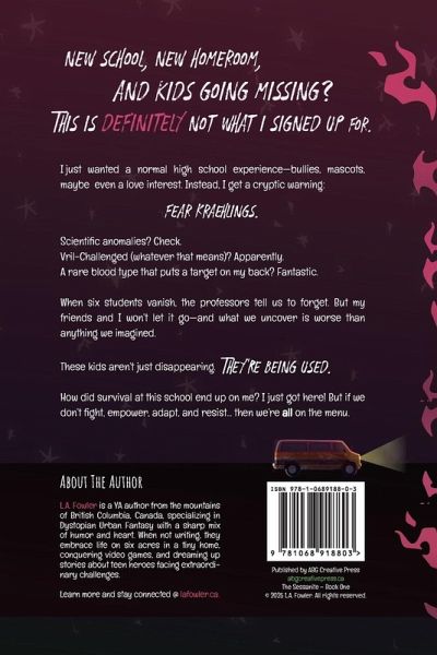 New school. New homeroom. And kids getting eaten? Yeah, this is definitely not what I signed up for. I just wanted a normal high-school experience-bullies, mascots, maybe even a love interest or two. Instead, I get a cryptic warning: Fear Kraehlings. Scientific anomalies? Check. Vril-Challenged? Whatever that means. Misfit friends? Obviously. A rare blood type that paints a target on my back? Fantastic. When six students vanish, the professors tell us to forget. But my friends and I won't let it go-and what we uncover is worse than anything we imagined. These kids aren't just missing. They're being served. How did survival at this school end up on me? I just got here. But if we don't fight, empower, adapt, and resist... We're all on the menu. - Not gory, just gutting - Perfect for fans of A Deadly Education, The Hunger Games, and The Rest of Us Just Live Here-a dark-academia fantasy with humour, heart, and haunting truths. Prophecies don't save anyone. People do. At Kraehlings Prep, silence keeps the system alive-until one student decides to fight back. Because hope doesn't wait for heroes; it makes them.
