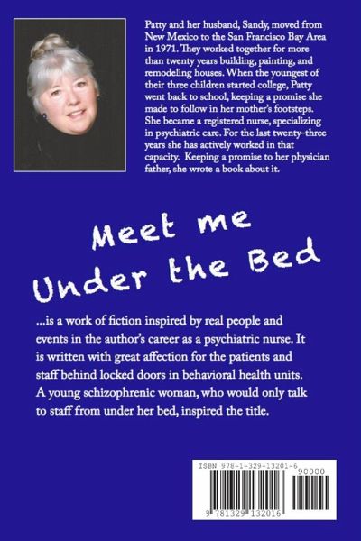 Meet me Under the Bed is a work of fiction inspired by real people and events in the author's career as a psychiatric nurse. It is written with great affection for the patients and staff behind locked doors in behavioral health units. A young schizophrenic woman, who would only talk to staff from under her bed, inspired the title.