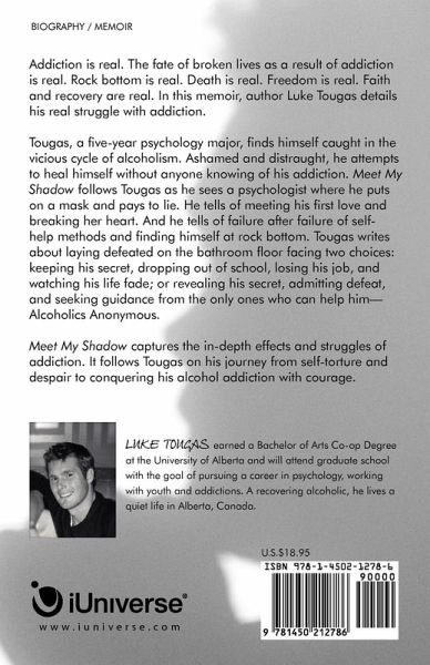 Addiction is real. The fate of broken lives as a result of addiction is real. Rock bottom is real. Death is real. Freedom is real. Faith and recovery are real. In this memoir, author Luke Tougas details his real struggle with addiction. Tougas, a five-year psychology major, finds himself caught in the vicious cycle of alcoholism. Ashamed and distraught, he attempts to heal himself without anyone knowing of his addiction. Meet My Shadow follows Tougas as he sees a psychiatrist where he puts on a mask and pays to lie. He tells of meeting his first love and breaking her heart. And he tells of failure after failure of self-help methods and finding himself at rock bottom. Tougas writes about laying defeated on the bathroom floor facing two choices: keeping his secret, dropping out of school, losing his job, and watching his life fade, or revealing his secret, admitting defeat, and seeking guidance from the only ones who can help him-Alcoholics Anonymous. Meet My Shadow captures the in-depth effects and struggles of addiction. It follows Tougas on his journey from self-torture and despair to conquering his alcohol addiction with courage.