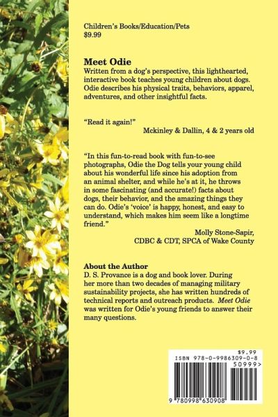 Written from a dog's perspective, this lighthearted, interactive book teaches young children about dogs. Odie describes his physical traits, behaviors, apparel, adventures, and other insightful facts. Paperback, 34 pgs Features: Engaging color photographs First person (dog) voice Conversational tone (you and me) Friendly educational messages Child-centric glossary Takeaways: Starts conversations Helps children better understand dogs Promotes enjoying dogs, nature, and exercise Encourages making friends and being curious