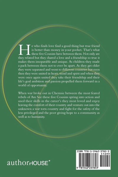 He who finds love find a good thing but true friend is better than money in your pocket. Thats what these five Cousins have between them. Not only are they related but they shared a love and a friendship so true it makes them inseparable and unique. As children they made a pack between them not to ever be apart. As they get older they were separated and went to different countries but even then they were united in heart, mind and spirit and when they were once again united they take their friendship and their lifes goal ambition and passion propelled them forward in a world of opportunity. When war broke out in Chemsie between the most feared rebels of Am See these five Cousins spring into action and used their skills in the careers they most loved and enjoy leaving the comfort of their country and venture out into the unknown a war torn country and fight for the safety of the less privileged and the poor giving hope to a community as well as to humanity.
