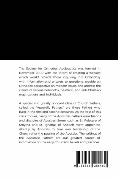 The Society for Orthodox Apologetics was formed in November 2009 with the intent of creating a website which would provide those inquiring into Orthodoxy with information and answers to questions, provide an Orthodox perspective on modern issues, and address the claims of various heterodox, heretical, and anti-Christian organizations and individuals. A special and greatly honored class of Church Fathers, called the "Apostolic Fathers," are those Fathers who lived in the first and second centuries. As the title of this class implies, many of the Apostolic Fathers were friends and disciples of Apostles. Some, such as St. Polycarp of Smyrna and St. Ignatius of Antioch, were appointed directly by Apostles to take over leadership of the Church after the passing of the Apostles. The writings of the Apostolic Fathers are our greatest source of information on the early Christians' beliefs and practices.
