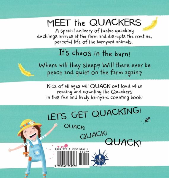 A special delivery of twelve quacking ducklings arrives at the farm and disrupts the routine, peaceful life of the barnyard animals. It's chaos in the barn! Where will they sleep? Will there ever be peace and quiet on the farm again? Kids of all ages will QUACK out loud when reading and counting the Quackers in this fun and lively barnyard counting book! LET'S GET QUACKING! QUACK! QUACK! QUACK!