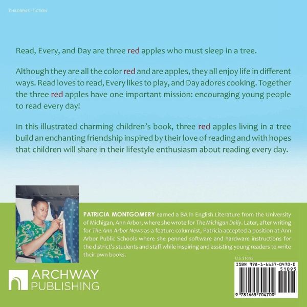 Read, Every, and Day are three red apples who must sleep in a tree. Although they are all the color red and are apples, they all enjoy life in different ways. Read loves to read, Every likes to play, and Day adores cooking. Together the three red apples have one important mission: encouraging young people to read every day! In this illustrated charming children's book, three red apples living in a tree build an enchanting friendship inspired by their love of reading and with hopes that children will share in their lifestyle enthusiasm about reading every day.