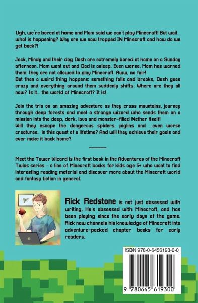 Get ready for action in this series of new Minecraft books for kids aged 7-11 years old! Ugh, we're bored at home and Mom said we can't play Minecraft! But wait... what is happening? Why are we now trapped IN Minecraft and how do we get back? Jack, Mindy and their dog Dash are extremely bored at home on a Sunday afternoon. Worse still, Mom has warned them: they are not allowed to play Minecraft. Aww, no fair! But then a weird thing happens: something falls and breaks, Dash goes crazy and everything around them suddenly shifts. Where are they all now? Is it... the world of Minecraft? It is! Join an amazing adventure in this new Minecraft chapter book as our three heroes cross mountains, journey through deep forests and meet a strange wizard who sends them on a mission into the deep, dark, lava and monster-filled Nether itself! Will they escape the dangerous spiders, piglins and ...even worse creatures... in this quest of a lifetime? And will they achieve their goals and ever make it back home? ¿¿¿¿¿¿¿¿¿¿¿¿¿¿¿¿¿¿¿¿¿¿¿¿¿¿¿¿¿¿¿¿¿¿¿¿¿¿¿¿¿¿¿¿¿¿¿¿¿¿¿¿¿¿¿¿¿¿¿¿¿¿¿ ¿ Rick Redstone's new Minecraft chapter books are perfect for 2nd graders, 3rd graders, 4th graders, 5th graders and 6th graders. ¿ Each Minecraft chapter book in this series features just the right mix of powerful storytelling, humor and Minecraft adventure to engage kids from start to finish. ¿ Each book in this new Minecraft series is a standalone, allowing readers to read the Adventures of the Minecraft Twins books in any order. ¿ Searching for Minecraft books for girls? Main character Mindy is bold, adventurous and strong. ¿ Looking for Minecraft books for boys? Mindy's twin Jack has brains and book smarts. ¿ Regardless of gender, readers dipping into these new Minecraft books will find great plots, strong writing, and a large dose of Minecraft adventure. ¿ As the characters in these new Minecraft books for kids take on quests in the Overworld, the action, characters and story will keep 6 year olds, 7 year olds, 8 year olds, 9 year olds and 10 year olds glued to the page! ¿ Minecraft chapter books are a great entry point for kids who are reluctant readers. These new Minecraft books will be help children fall in love with books! ¿¿¿ New Minecraft books from Rick Redstone are out monthly. ¿¿¿ Disclaimer: This book is a work of fanfiction; it is not an official Minecraft book. It is not endorsed, authorized, licensed, sponsored, or supported by Mojang AB, Microsoft Corp. or any other entity owning or controlling rights to the Minecraft name, trademarks or copyrights.