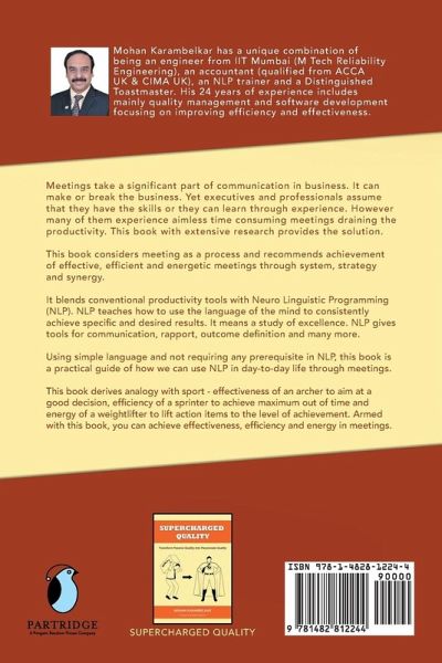 Meetings take a significant part of communication in business. It can make or break the business. Yet executives and professionals assume that they have the skills or they can learn through experience. However many of them experience aimless time consuming meetings draining the productivity. This book with extensive research provides the solution. This book considers meeting as a process and recommends achievement of effective, efficient and energetic meetings through system, strategy and synergy. It blends conventional productivity tools with Neuro Linguistic Programming (NLP). NLP teaches how to use the language of the mind to consistently achieve specific and desired results. It means a study of excellence. NLP gives tools for communication, rapport, outcome definition and many more. Using simple language and not requiring any prerequisite in NLP, this book is a practical guide of how we can use NLP in day-to-day life through meetings. This book derives analogy with sport - effectiveness of an archer to aim at a good decision, efficiency of a sprinter to achieve maximum out of time and energy of a weightlifter to lift action items to the level of achievement. Armed with this book, you can achieve effectiveness, efficiency and energy in meetings.