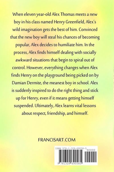 When eleven year-old Alex Thomas meets a new boy in his class named Henry Greenfield, AlexÕs wild imagination gets the best of him. Convinced that the new boy will steal his chances of becoming popular, Alex decides to humiliate him. In the process, Alex finds himself dealing with socially awkward situations that begin to spiral out of control. However, everything changes when Alex finds Henry on the playground being picked on by Damian Dermite, the meanest boy in school. Alex is suddenly inspired to do the right thing and stick up for Henry, even if it means getting himself suspended. Ultimately, Alex learns vital lessons about respect, friendship, and himself. CHARACTER DEVELOPMENT - Friendship, Loyalty, Respect, Kindness, Reflection, Self-Esteem, Peer-Pressure