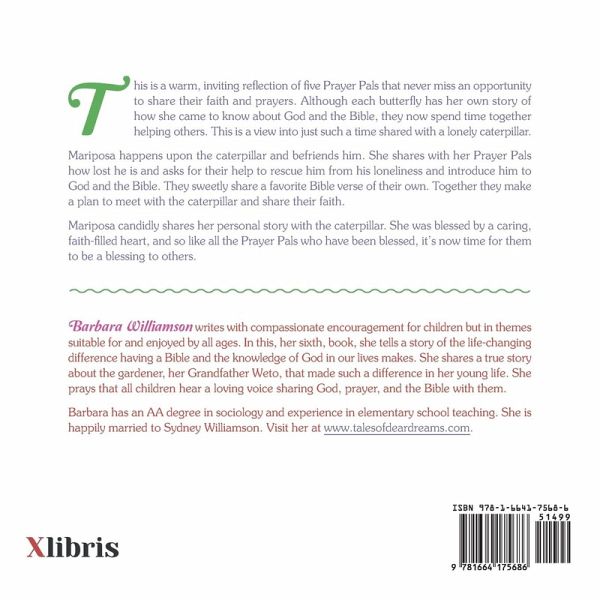 This is a warm, inviting reflection of five Prayer Pals that never miss an opportunity to share their faith and prayers. Although each butterfly has her own story of how she came to know about God and the Bible, they now spend time together helping others. This is a view into just such a time shared with a lonely caterpillar. Mariposa happens upon the caterpillar and befriends him. She shares with her Prayer Pals how lost he is and asks for their help to rescue him from his loneliness and introduce him to God and the Bible. They sweetly share a favorite Bible verse of their own. Together they make a plan to meet with the caterpillar and share their faith. Mariposa candidly shares her personal story with the caterpillar. She was blessed by a caring, faith-filled heart, and so like all the Prayer Pals who have been blessed, it's now time for them to be a blessing to others.