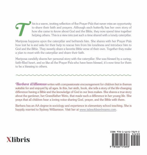 This is a warm, inviting reflection of five Prayer Pals that never miss an opportunity to share their faith and prayers. Although each butterfly has her own story of how she came to know about God and the Bible, they now spend time together helping others. This is a view into just such a time shared with a lonely caterpillar. Mariposa happens upon the caterpillar and befriends him. She shares with her Prayer Pals how lost he is and asks for their help to rescue him from his loneliness and introduce him to God and the Bible. They sweetly share a favorite Bible verse of their own. Together they make a plan to meet with the caterpillar and share their faith. Mariposa candidly shares her personal story with the caterpillar. She was blessed by a caring, faith-filled heart, and so like all the Prayer Pals who have been blessed, it's now time for them to be a blessing to others.